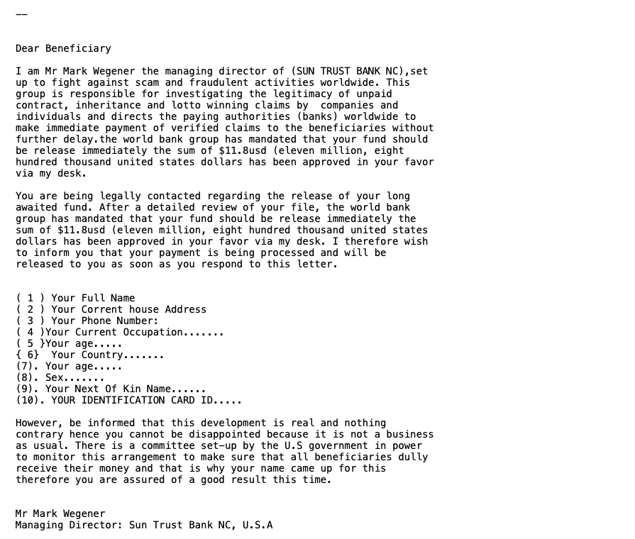 This email allegedly has been sent by Sun Trust Bank of course there are many clues that this is spam mail. Just in case you don't know, which is hard to believe these days but the mail is not addresses to be, there is a promise of lots of money and a request for all your personal data. OH I wonder why they would need this, ah yes of course, they want to send me lots of money, these very kind people.